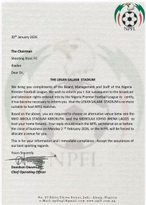 “Based on the above, you are required to choose an alternative venue between the MKO ABIOLA STADIUM ABEOKUTA and the MOBOLAJI JOHNSON ARENA LAGOS to host your home fixtures. Your reply should reach the NPFL secretariat on or before the close of business on Monday 2nd February 2026, or the NPFL will be forced to allocate a venue for you.